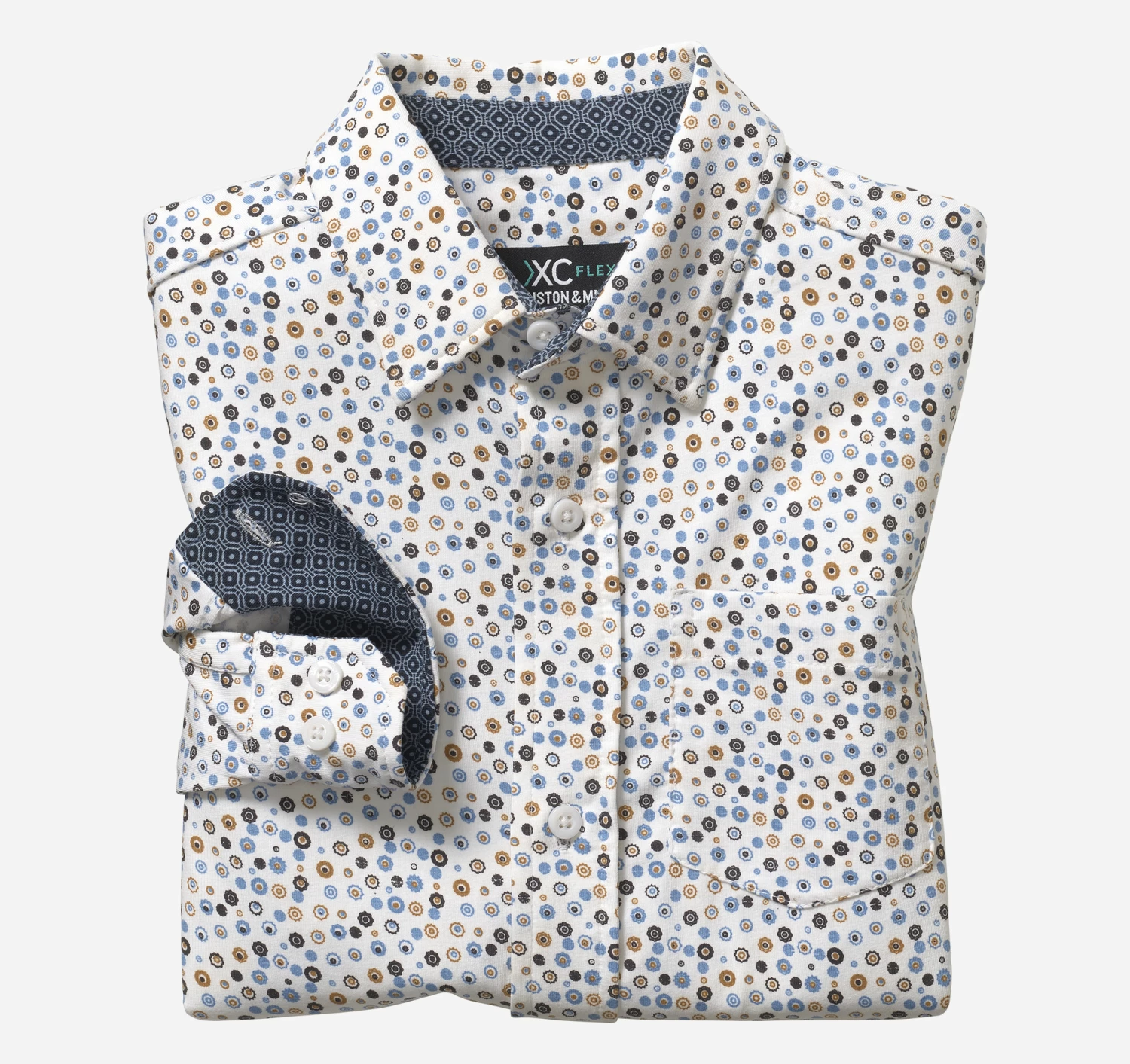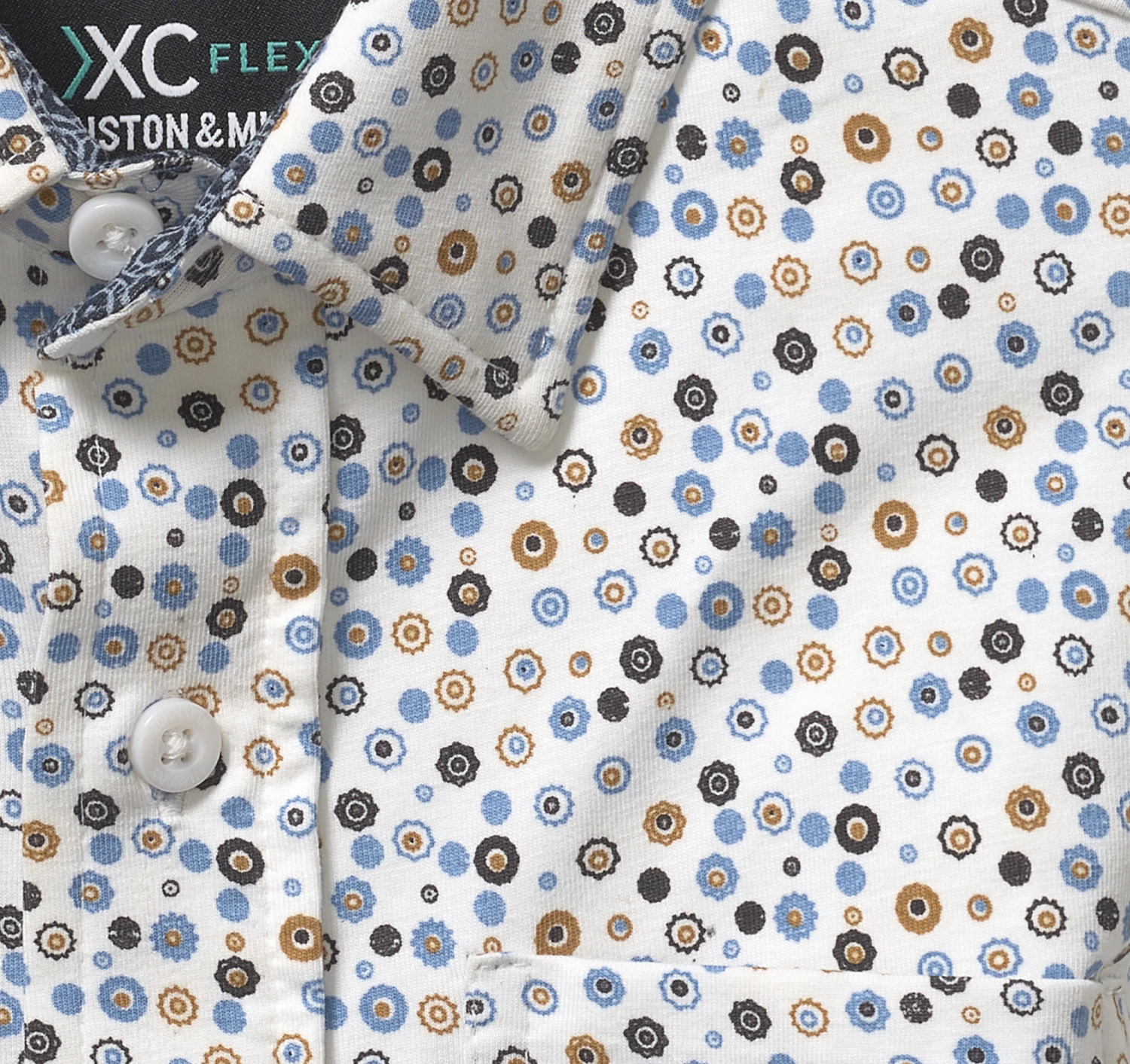 - A stretchy approach to the classic button-front shirt in fun prints and one solid.