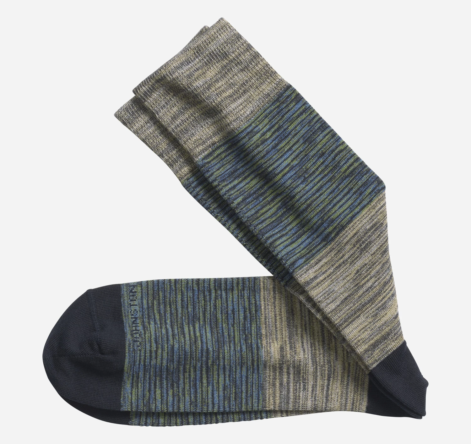 - Colorblock combinations of space dye and heather yarns create a rich look for casual styling.