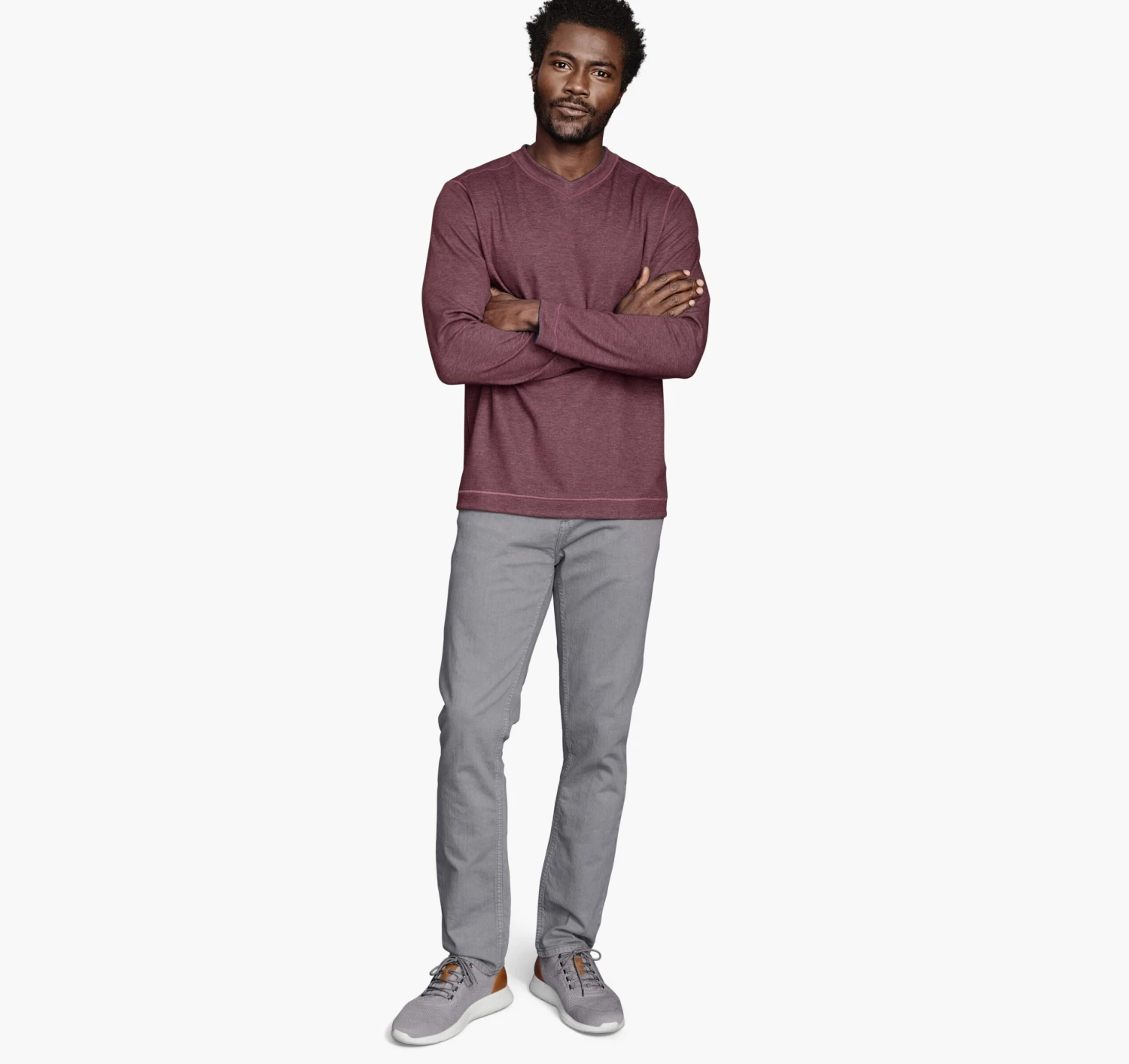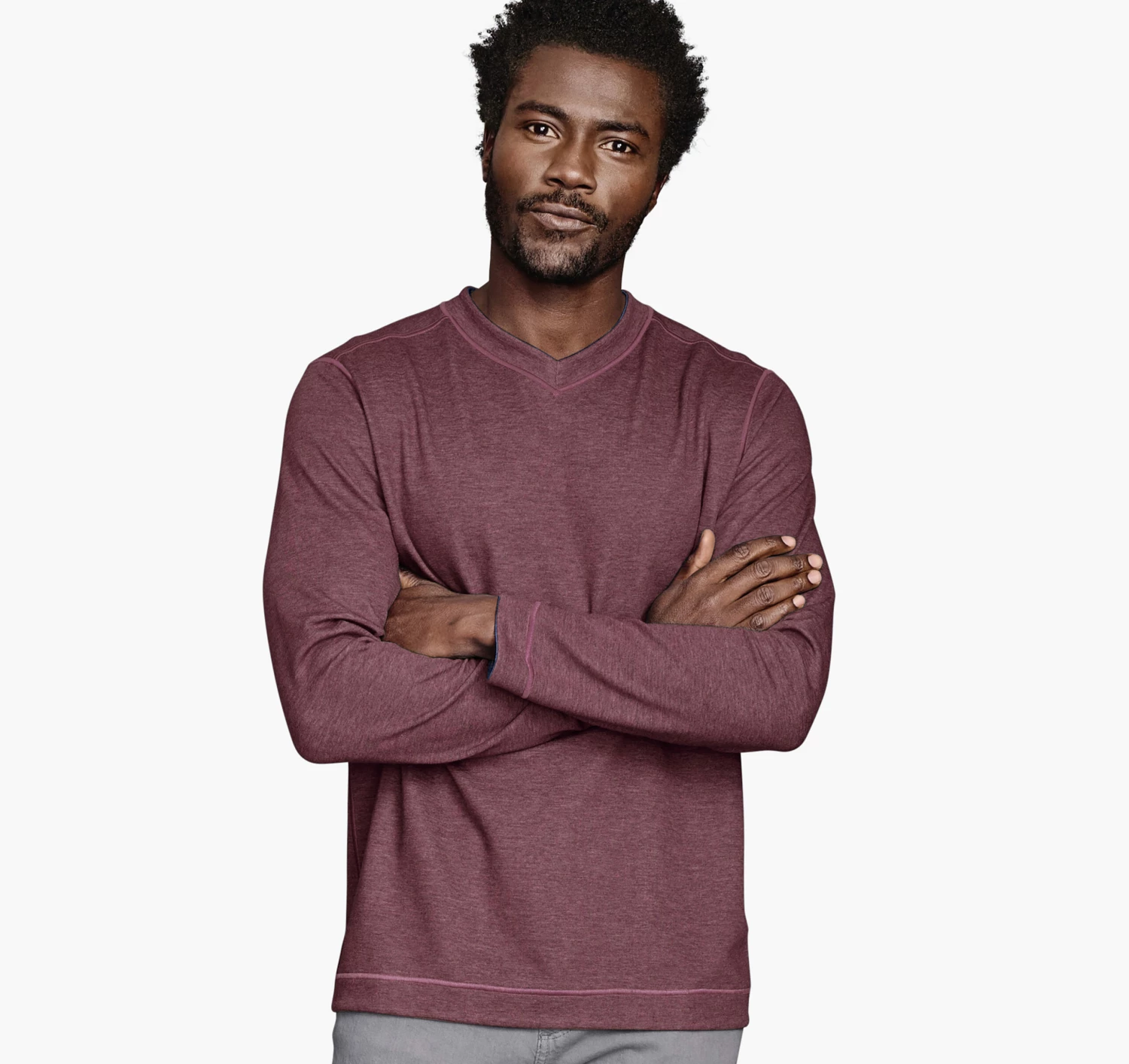 - Soft, lightweight double-faced knit reverses to contrast heathered shade.