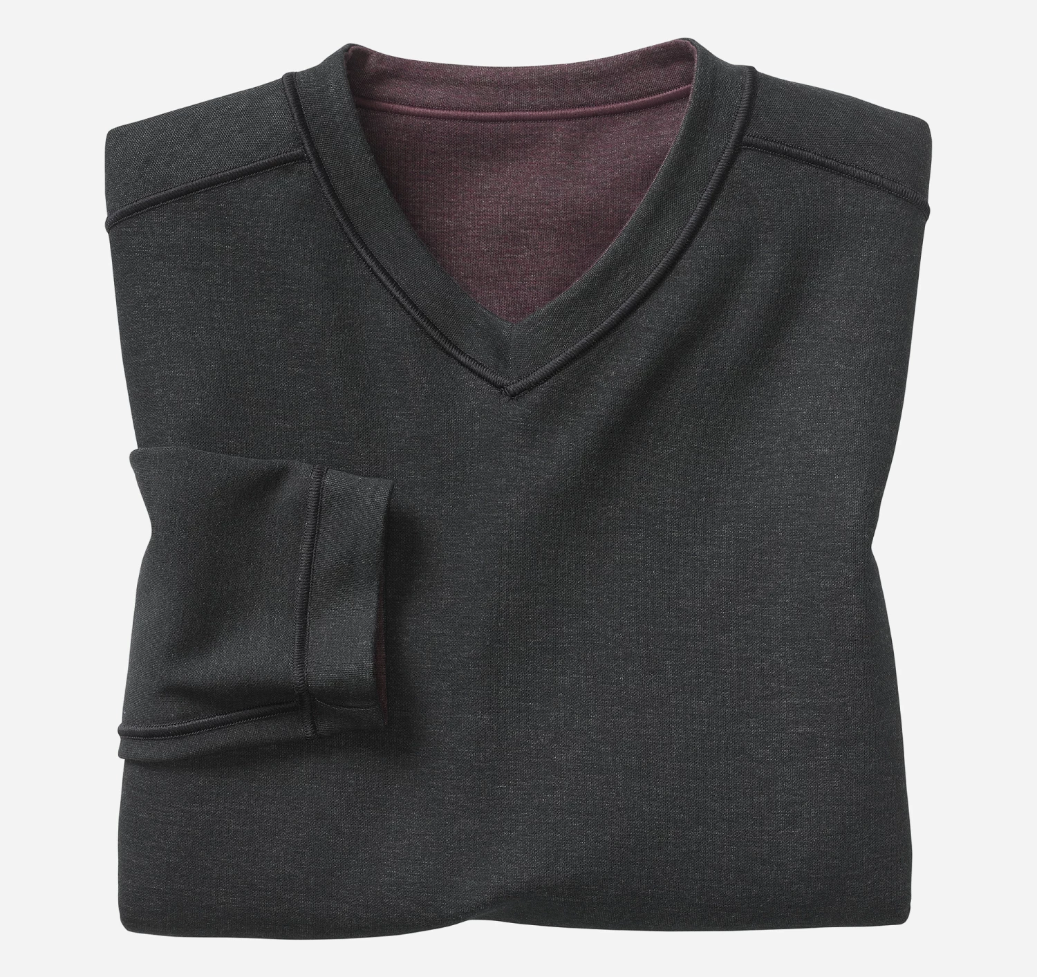 - Soft, lightweight double-faced knit reverses to contrast heathered shade.