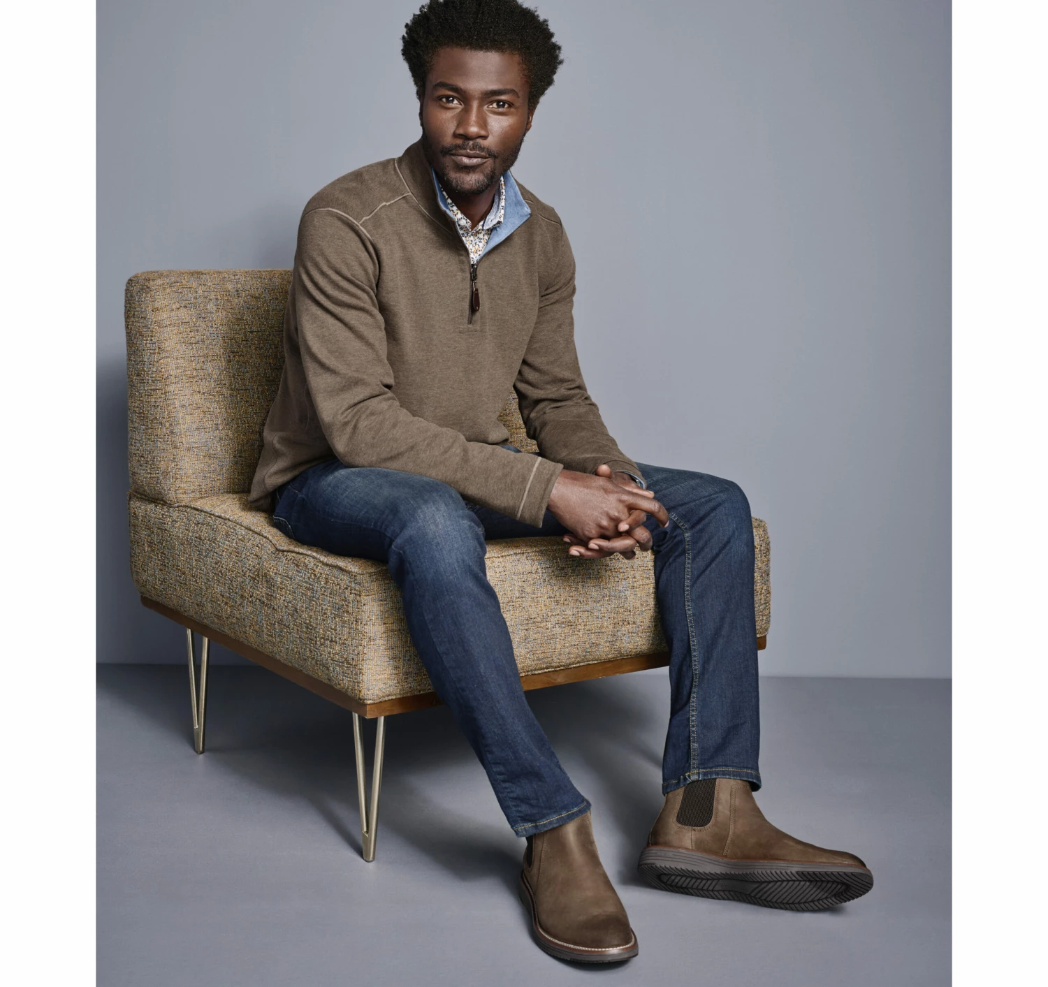 - Quarter-zip placket with leather-look pull.