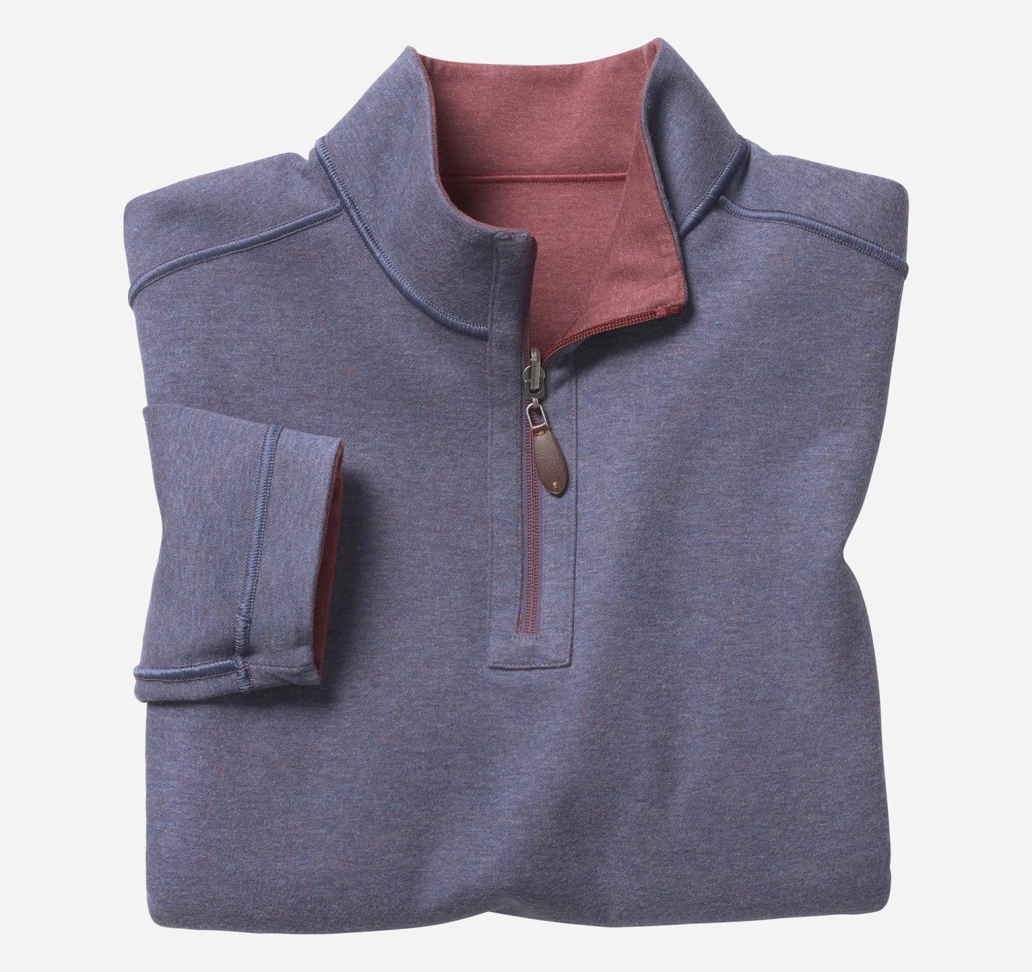 - Soft cotton-blend knit reverses from solid to coordinating heather shade.